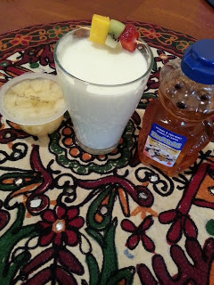 Mango Lassi: "My son is a huge mango fan.. Especially Alphanso mangoes.. He loves to drink this lassi but in a different manner though. He will keep in in the freezer for half an hour and then lick it with his spoon when it becomes slightly icy."