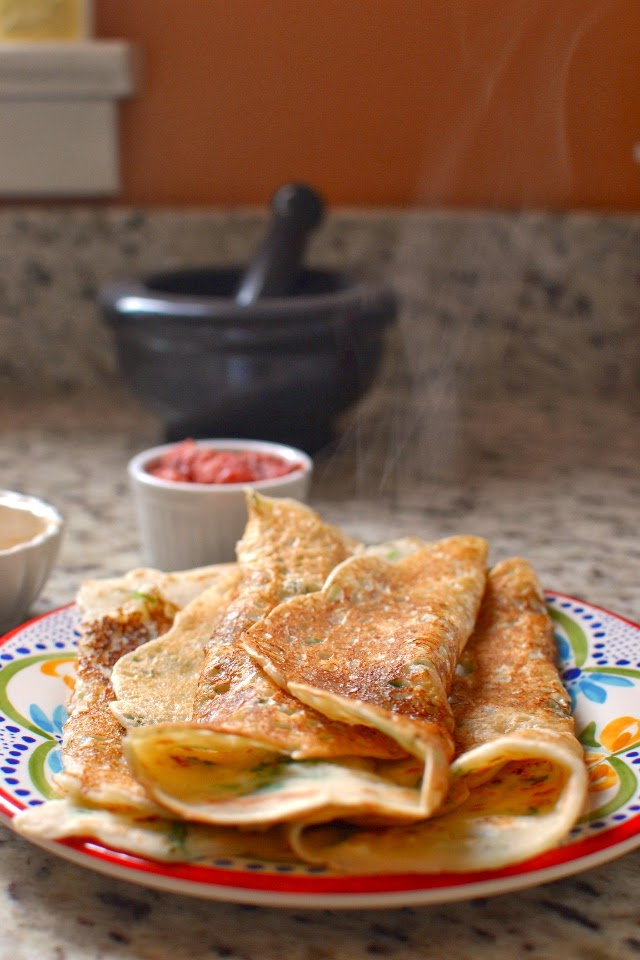 - When ready to make dosas, mix cumin seeds, green chilies and chopped cilantro in the batter.