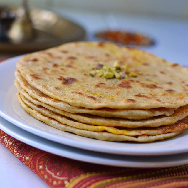 These carrot halwa stuffed polis are very colorful and festive -- perfect for a festival especially for Diwali. I added some saffron to both the filling and the dough to give flavor and beautiful orange color. Leftovers can be wrapped tightly in foil and refrigerated. When ready to eat, simply microwave and eat with a generous smear of ghee.