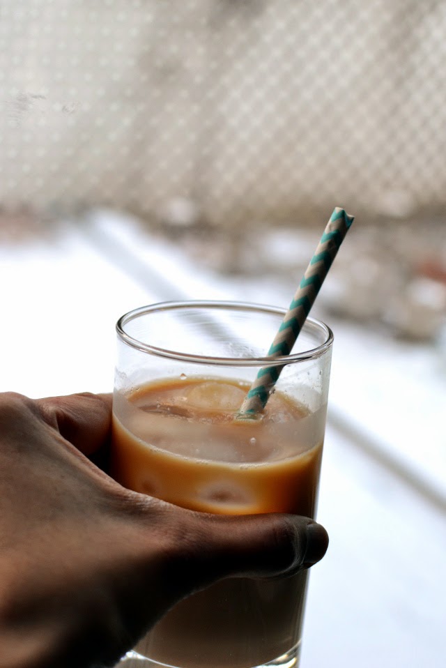 This is totally not the time to post this Iced tea recipe because as I look out of the window, I see snow flurries and we have a snow blizzard with 1~2 feet of snow in the future for tomorrow. I made this tea couple of weeks ago when the temperatures where way below freezing (see the white sheet of snow in the background in the picture below?). I guess this is my way of saying 'Bring it on winter -- you don't scare me (?????)'. Anyway someone out there must have sunny weather and they'll probably appreciate my post ;-)