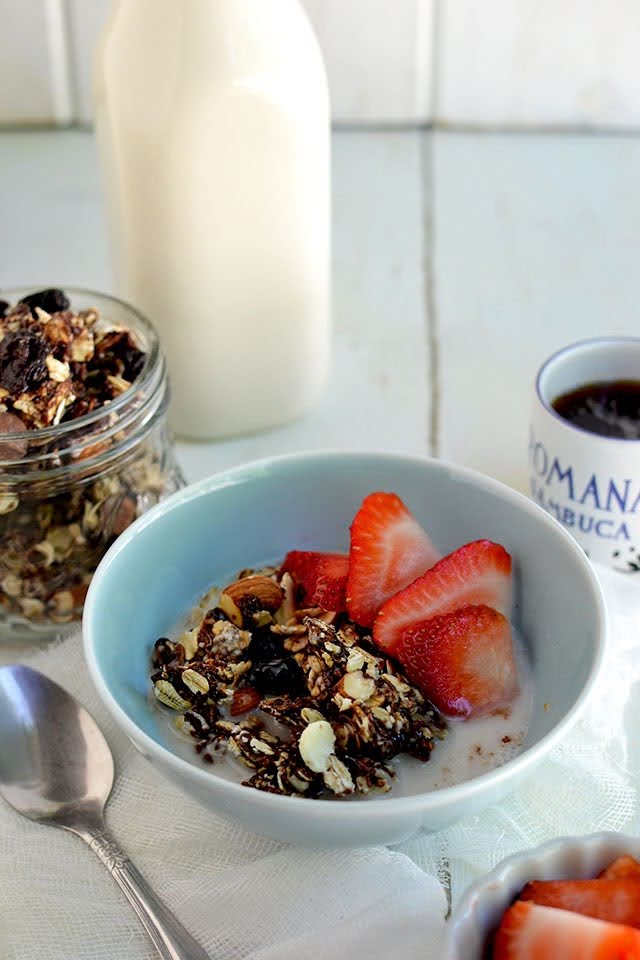 Today's kid friendly breakfast happens to be my favorite too. I couldn't stop myself munching on this delicious and addictive granola. Recipe for this chocolate granola is from Bobby Flay's 'Brunch with Bobby' cooking show. I had the recipe bookmarked for a very very long time and finally made it for the kids.